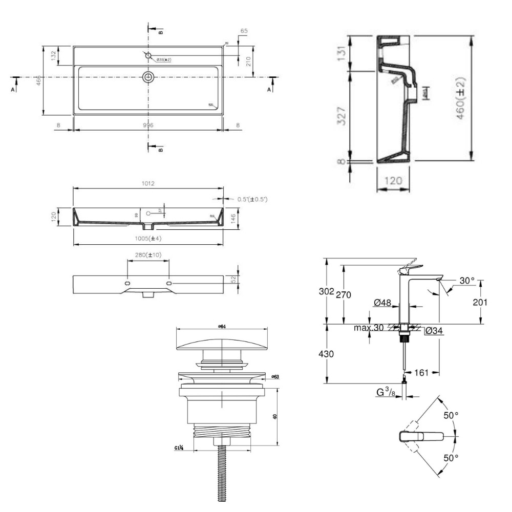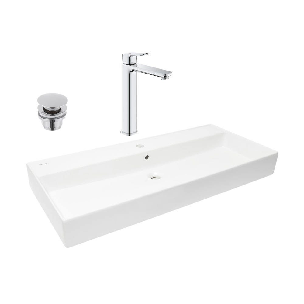 Caractéristiques du mitigeur monocommande à levier pour vasque à poser, taille XL, sans vidage, Grohe Quickfix Dice, chrome brillant + lavabo à suspendre et à poser 100,4x46,5 cm, avec bonde Clic-Clac, Swiss Aqua Technologies Infinitio (BA3-G1018920000-06) :