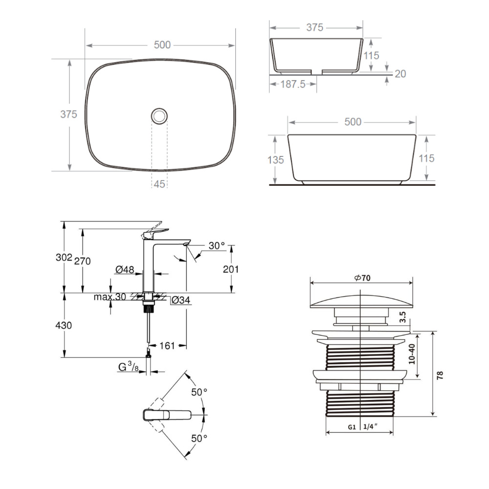 Caractéristiques du mitigeur monocommande à levier pour vasque à poser, taille XL sans vidage, Grohe Quickfix Dice, chrome brillant + Vasque à poser rectangulaire 50 x 37,5 x 13,5 cm, avec bonde Clic-Clac, sans trop-plein, Ceramia PixL, blanc brillant (BA3-G1018920000-07) :