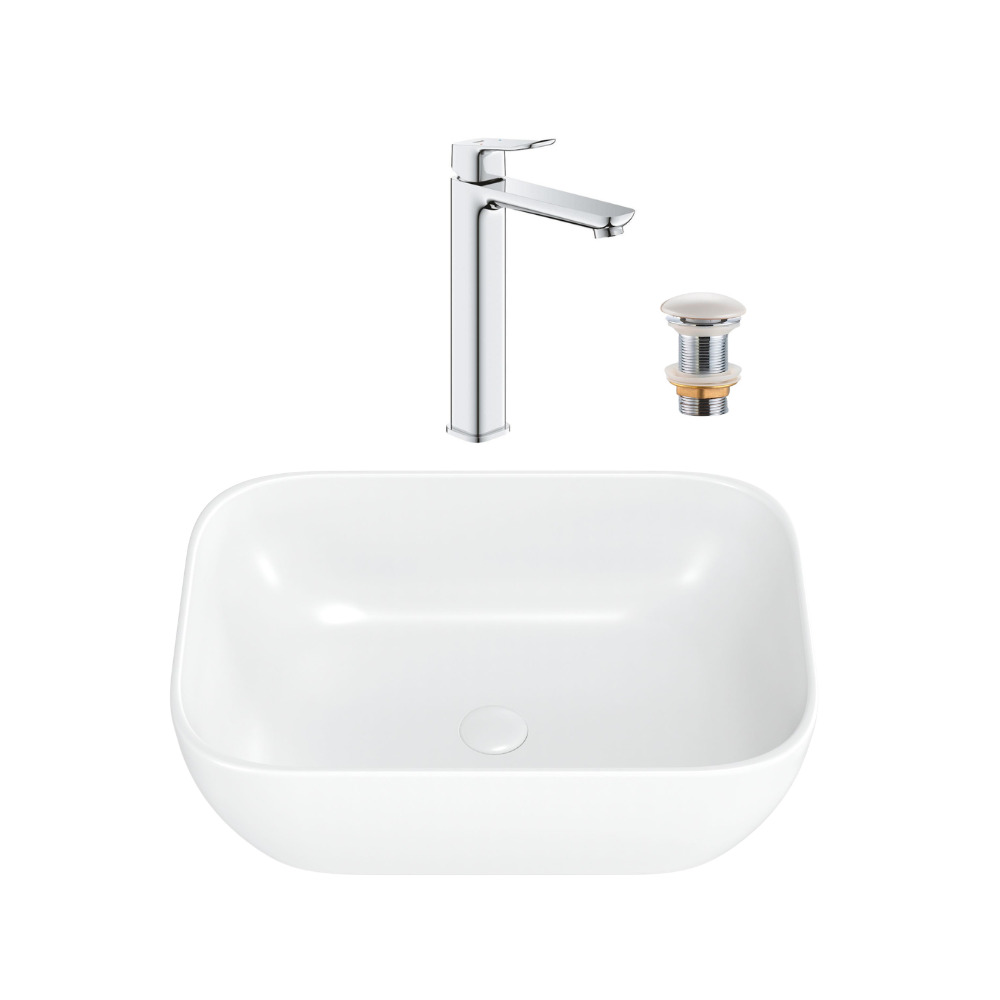 Caractéristiques du mitigeur monocommande à levier pour vasque à poser, taille XL, sans vidage, Grohe Quickfix Dice, chrome brillant + vasque à poser 45,5x32,5x13,5 cm, avec bonde Clic-Clac, sans trop-plein, Swiss Aqua Technologies Infinitio, blanc mat (BA3-G1018920000-08) :