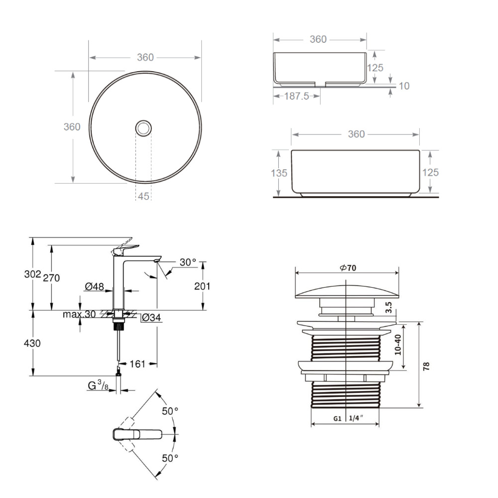 Caractéristiques du mitigeur monocommande à levier pour vasque à poser, taille XL, sans vidage, Grohe Quickfix Dice, chrome brillant + Vasque à poser ronde 36 x 12,5 cm, avec bonde Clic-Clac, sans trop-plein, Ceramia PixL, blanc brillant (BA3-G1018920000-09) :