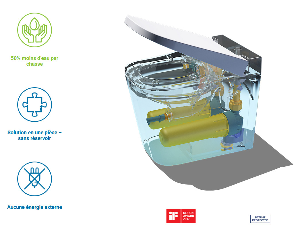 Équipé de la technologie brevetée OptimFlush™, Ultimax fonctionne uniquement avec la pression du réseau d’eau, sans électricité ni réservoir encastré. Son volume de chasse réglable (de 2,4 à 4 litres) permet de réaliser des économies d’eau significatives, tout en assurant une efficacité de rinçage optimale, même avec une pression minimale de 2,2 bars.