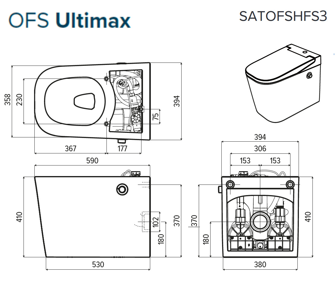 Grâce à sa conception tout-en-un avec fixations murales invisibles, Ultimax s’installe aussi simplement qu’un WC classique. Il se raccorde à l’eau froide via un robinet d’angle et un flexible (non inclus), sans nécessité de gros travaux – à condition de respecter l’emplacement de l’évacuation arrière (Ø102 mm).