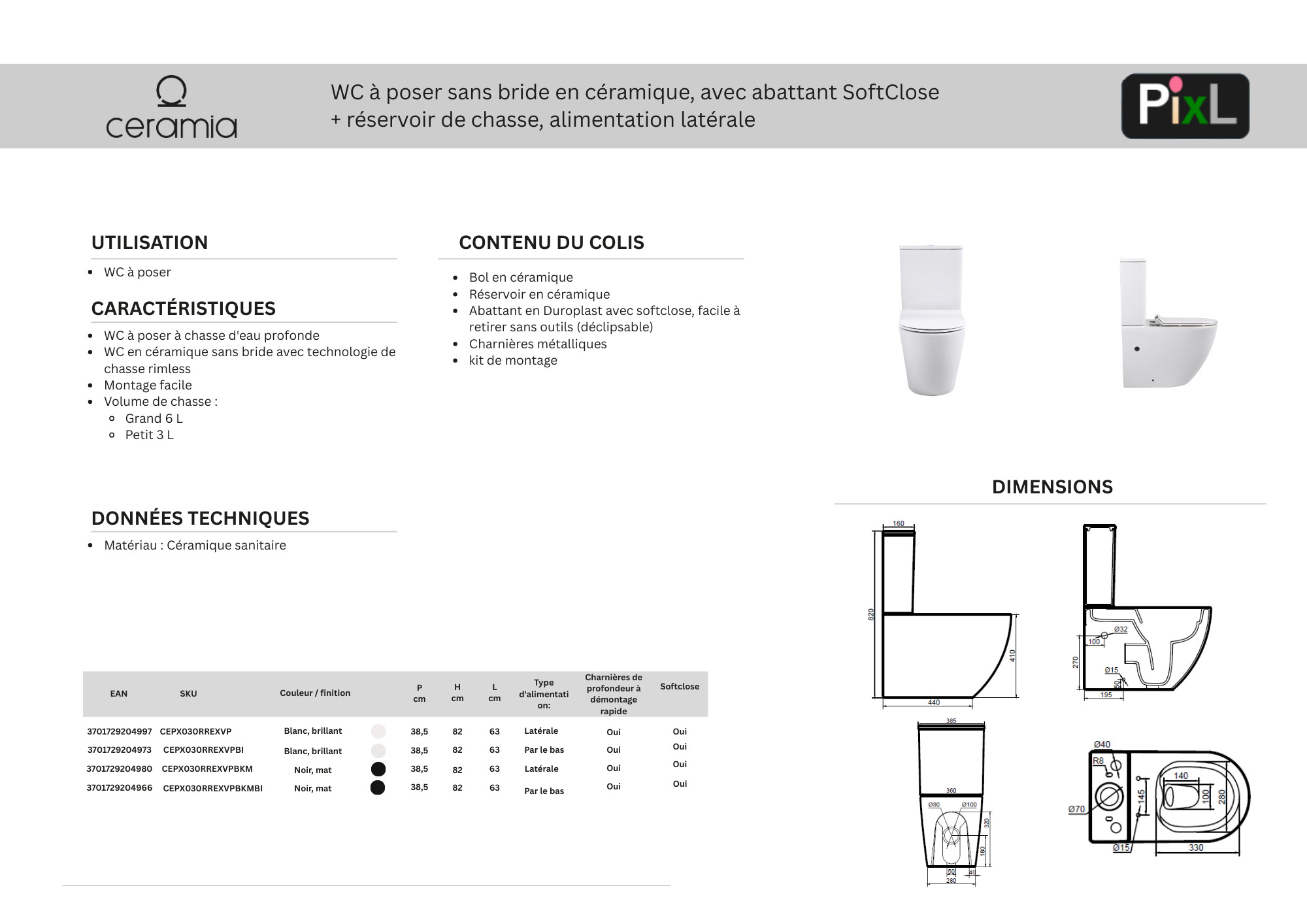 La série PixL ne se limite pas à ce modèle : elle propose une collection complète de céramique sanitaire comprenant des WC suspendus, des WC à poser, des lavabos de différentes formes et plusieurs coloris assortis comme CEPX3636BKM, CEPX4937BKM, CEPX5037BKM et CEPX5038BKM. Le modèle CEPX030RREXVPBKM est donc un choix idéal si vous recherchez un WC pratique et élégant, parfaitement coordonné avec le reste de votre salle de bains.