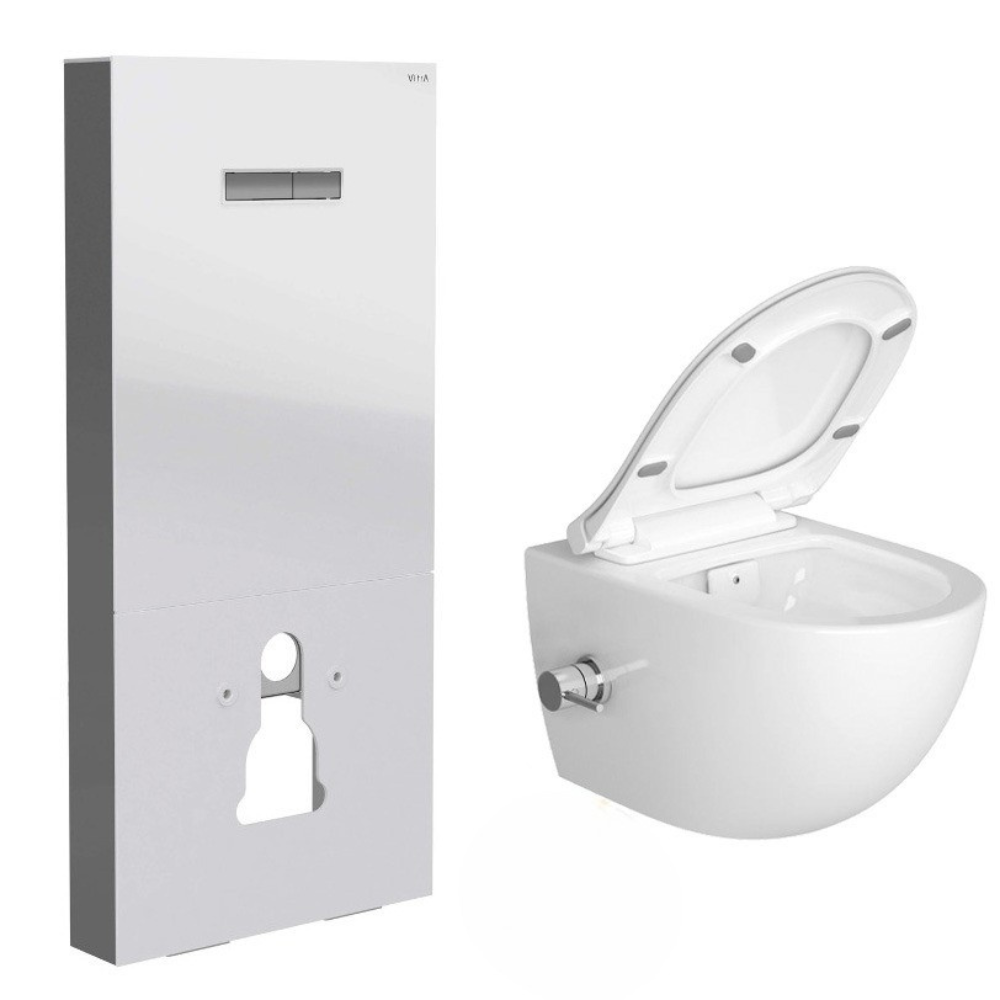 Vitra Pack WC Bâti support en verre trempé/aluminium brossé avec plaque intégrée, Blanc + WC sans bride SAT, fonction bidet