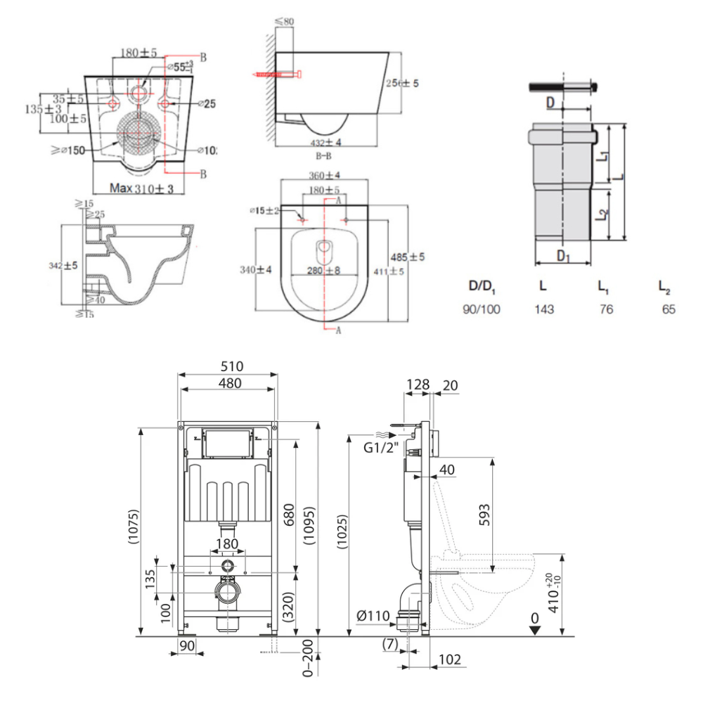 - Plage de réglage devant mur : 135-205mm (lorsque monté sur des supports muraux)
