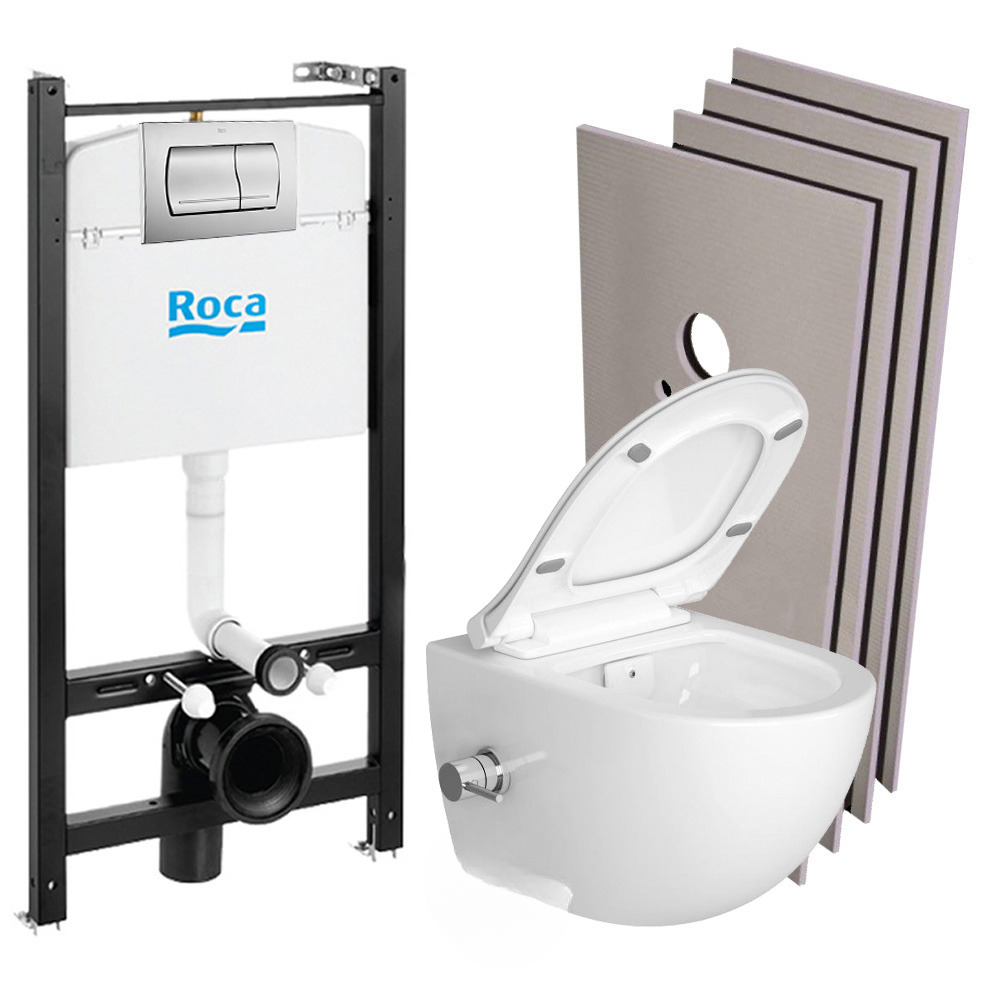 Pack Bâti-support Roca Active + WC sans bride avec fonction bidet et fixations invisibles + plaque chrome mat + Set d'habillage