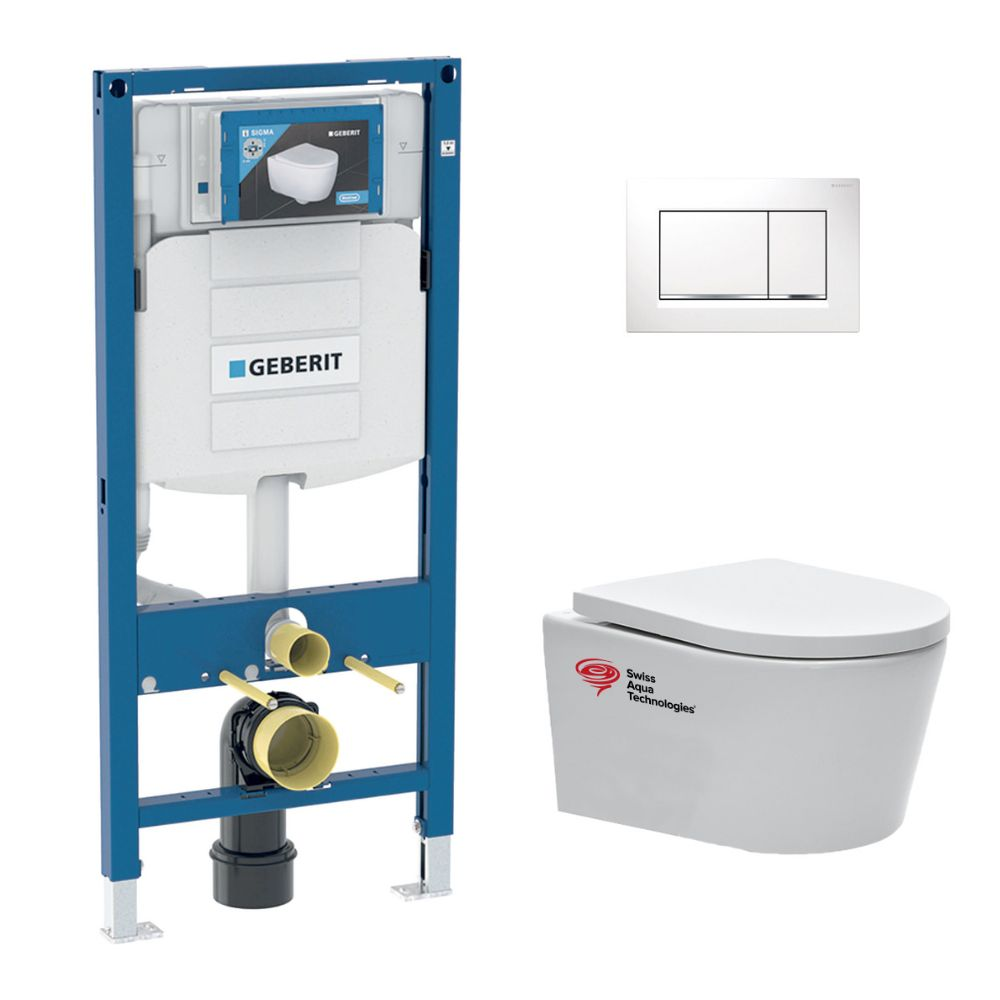 Pack WC Bati Geberit + Cuvette sans bride Swiss Aqua Technologies + Abattant SoftClose + plaque blanche (GebSATrimless-H)
