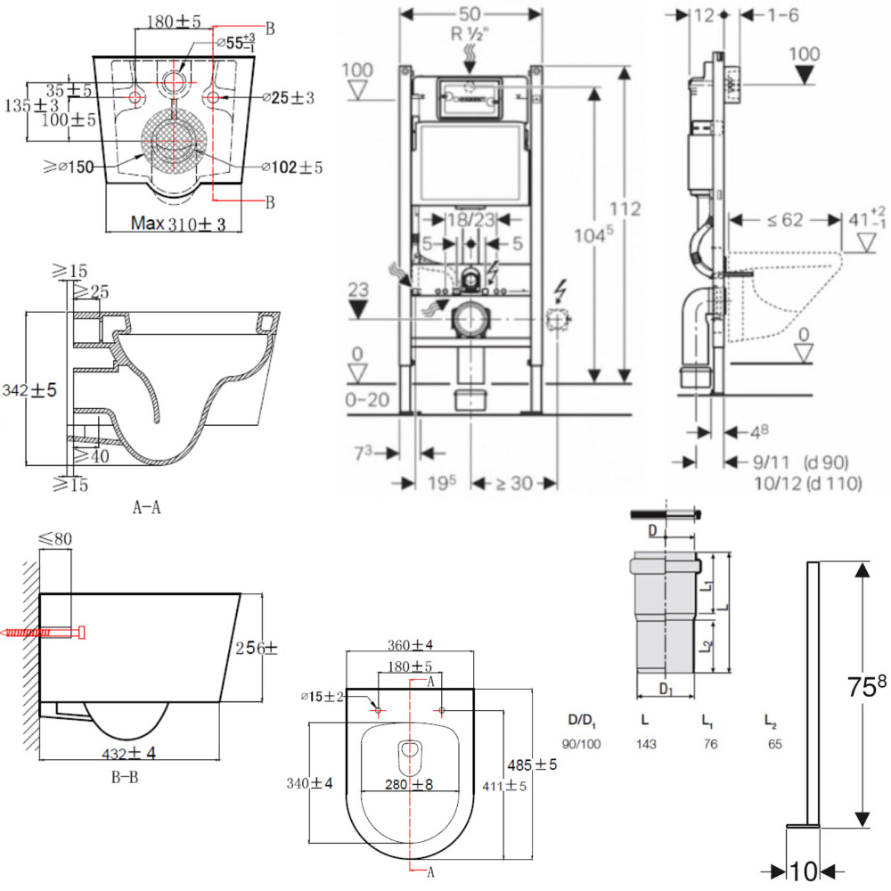 Ces bâti-supports pour WC suspendus ne peuvent être installés contre des cloisons en plaques de plâtre à âme alvéolaire en carton, contre des cloisons en plaques de plâtre sur ossature métallique ou contre des cloisons de séparation double peau en plaques de plâtre sur ossature métallique sans accessoirisation additionnelle (substitution des pieds fournis par des pieds autoportants) ou l'ajout de renforts complémentaires (à intégrer au préalable dans la cloison au niveau des fixations hautes).