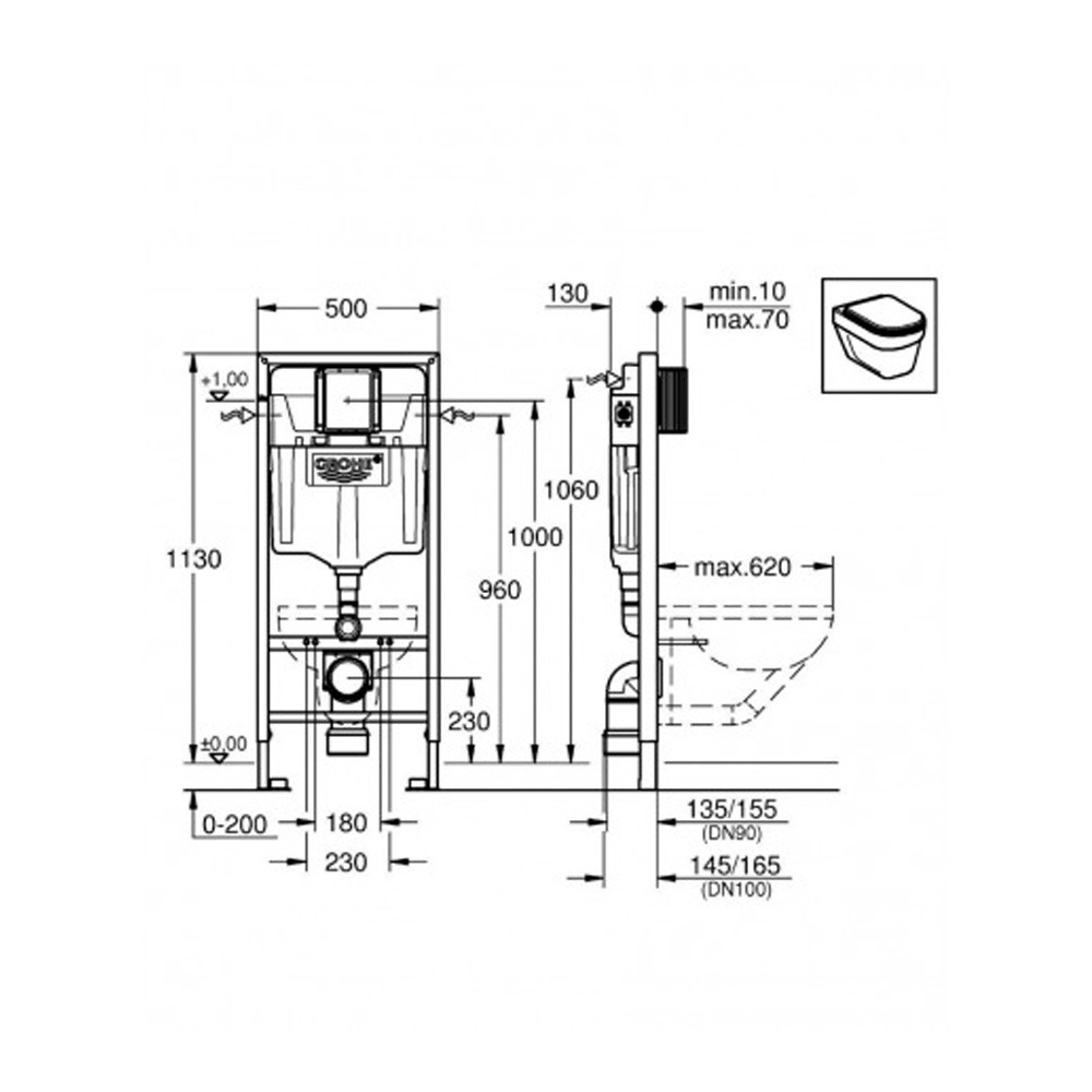 Une cuvette sans bride pour une hygiène impeccable, un abattant soft-close pour le confort, une plaque de commande coloris Blanc Alpin GROHE, un bâti support classique GROHE et un set d'habillage de la marque Jackon pour une esthétique moderne. Transformez votre salle de bains en un espace de bien-être ultime.