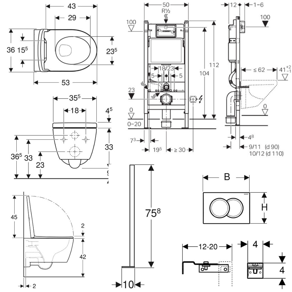 Caractéristiques du Pack Autoportant Bâti-support Duofix + WC sans bride Geberit iCon + Abattant softclose + Jeu de pieds autoportants pour bâti-support Geberit Duofix + Plaque blanche (iConGebX) :