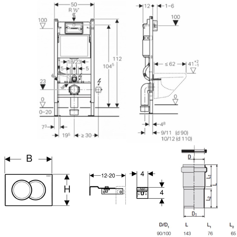 Caractéristiques du Geberit Delta Pack bâti-support Duofix 112cm + Plaque de commande Delta01, Blanche + Fixations murales (111.154.11.3) :
