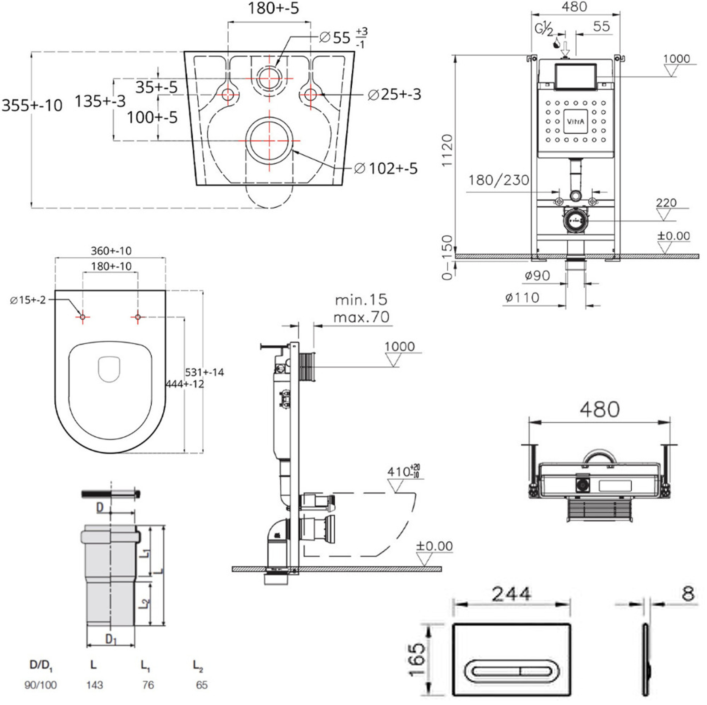 Caractéristiques du Pack WC Bâti-support V-Fix Core + WC sans bride SAT Brevis + Plaque Chrome brillant (V-FixBrevis-8) :