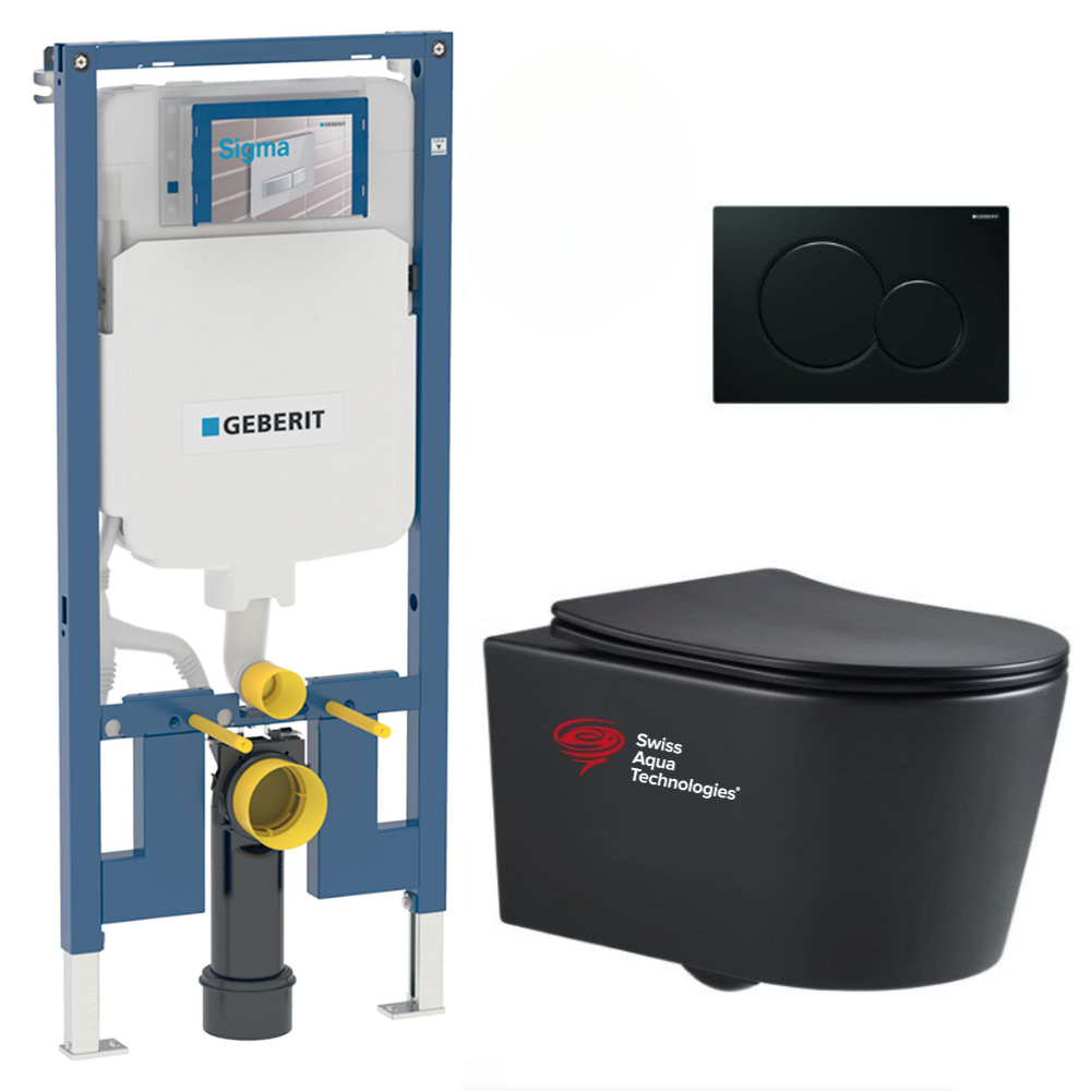 Pack WC Bati-support Geberit slim + WC sans bride Swiss Aqua Technologies + plaque noire mat (SLIMBLSATASP)