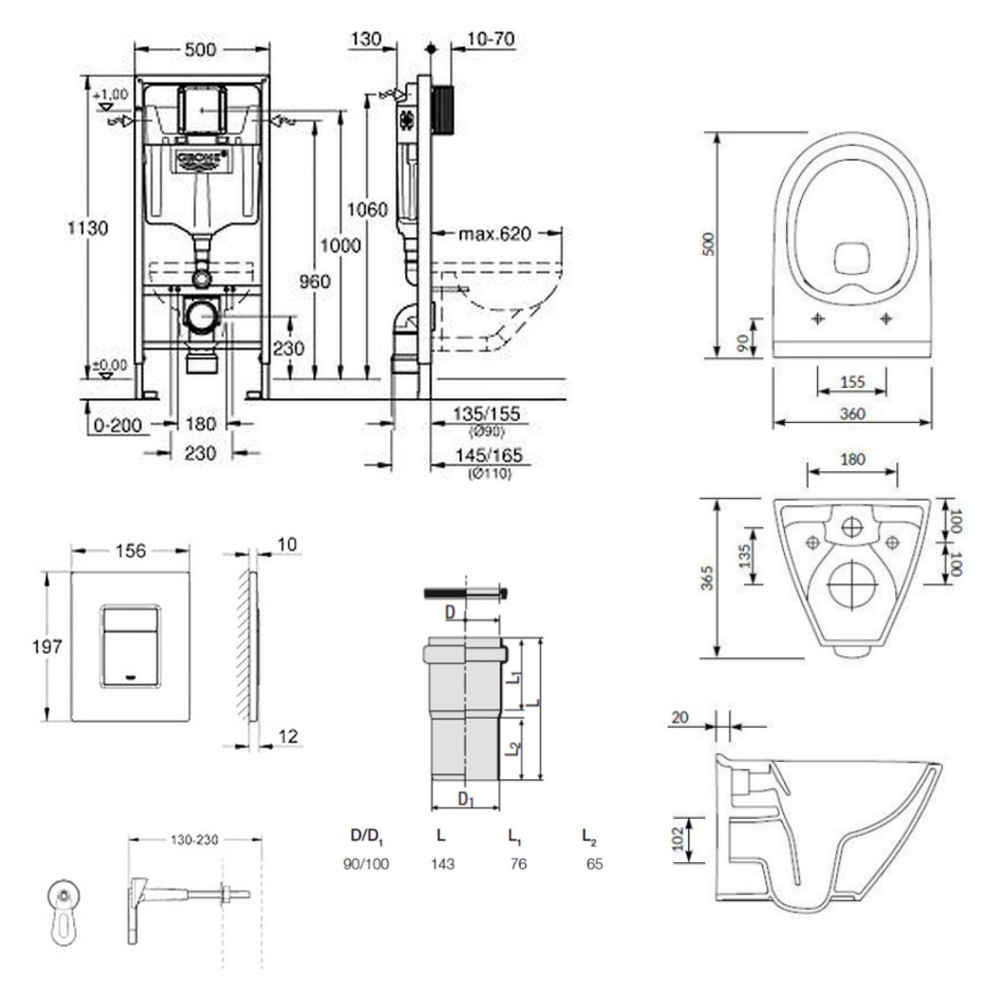 Caractéristiques du pack WC Bâti-support Grohe Rapid SL + Cuvette sans bride Cersanit + Abattant SoftClose + Plaque chrome (RAPIDSL-MILLE) :