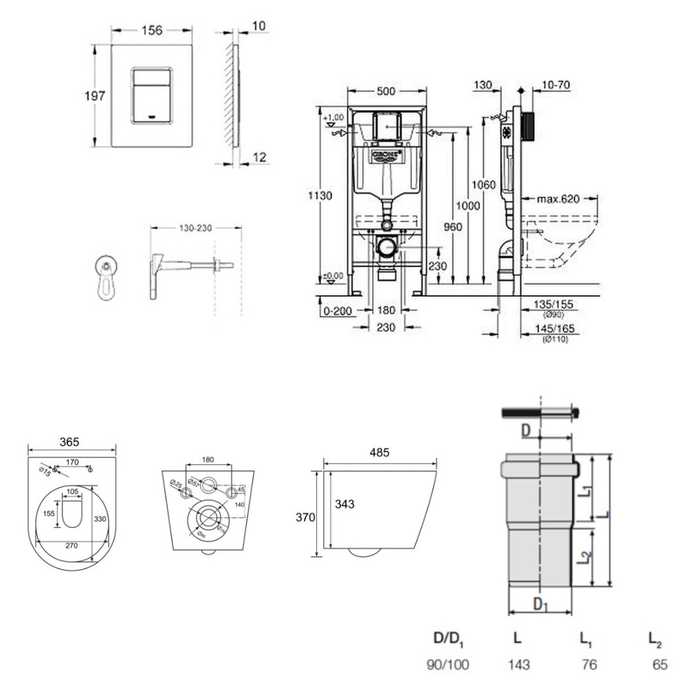Caractéristiques du pack WC bâti-support Grohe Rapid SL + WC SAT sans bride + abattant SoftClose + plaque chrome (RSLCETOR1) :