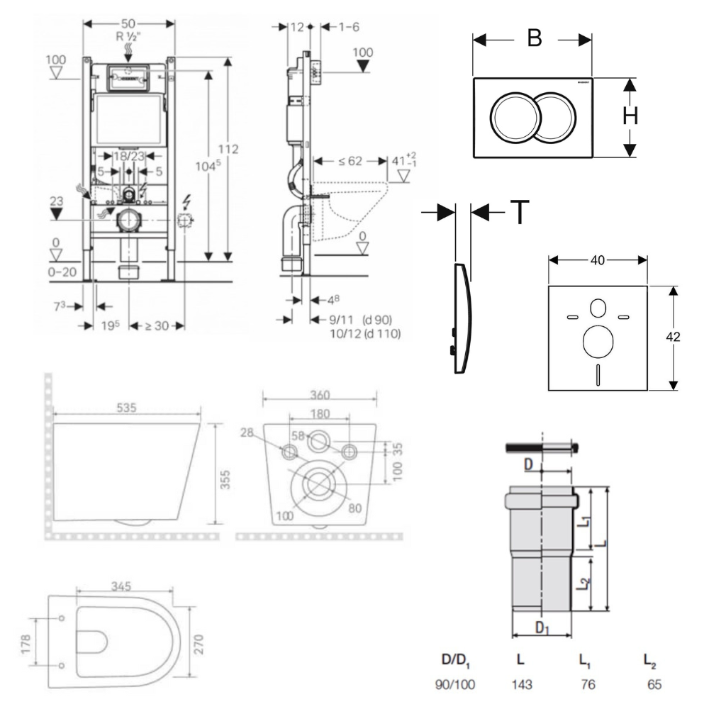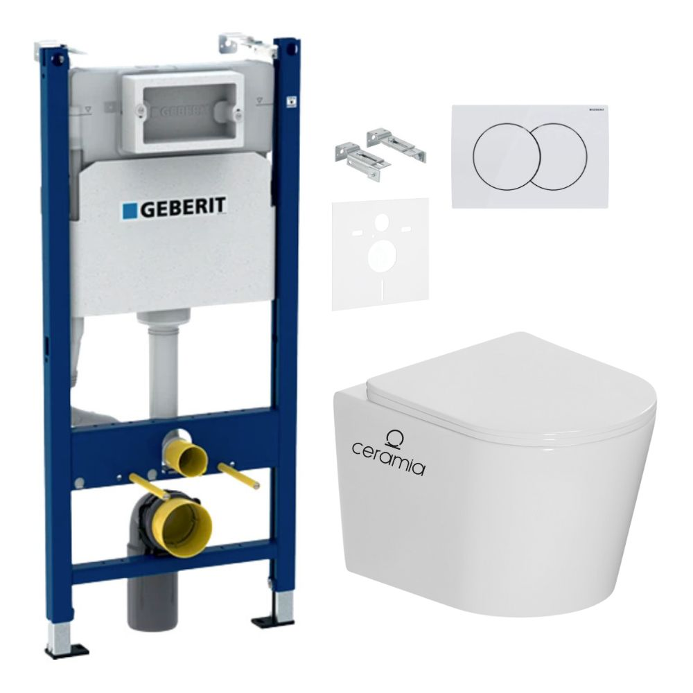 Caractéristiques du pack WC bâti-support Geberit Duofix 112cm + WC sans bride Ceramia + abattant SoftClose + set d'isolation + plaque blanche (CETORGEB3SET) :