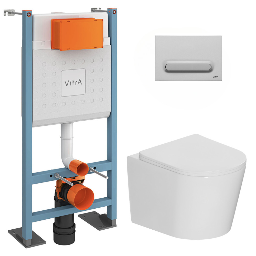 Caractéristiques du pack WC bâti-support autoportant Vitra V-Fix Core + WC suspendu sans bride + abattant SoftClose + Plaque chrome mat (VFTFCETOR5) :