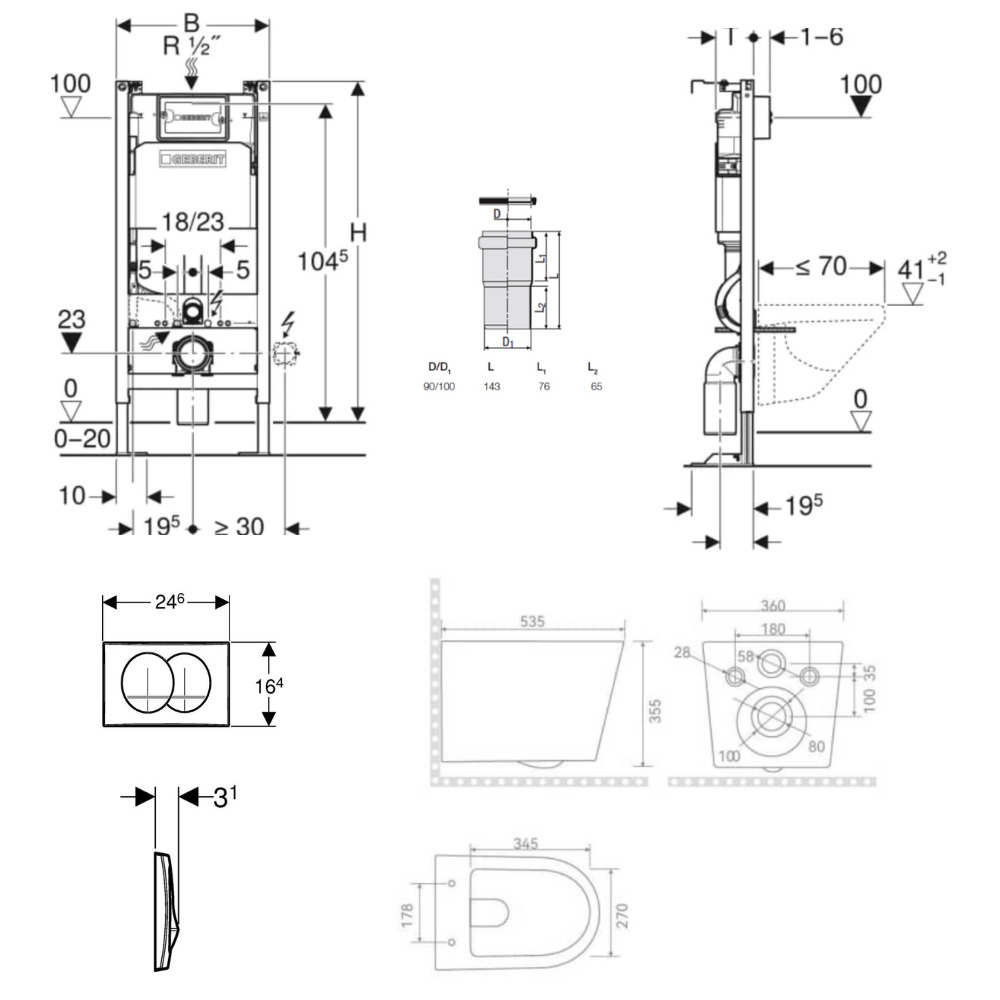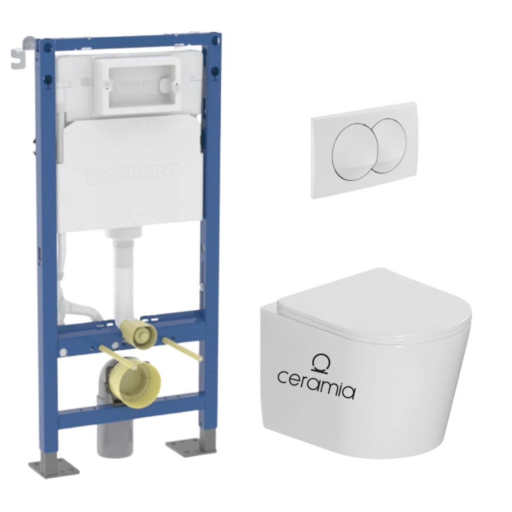 Caractéristiques du Pack WC bâti-support autoportant Duofix 112cm + WC suspendu Ceramia sans bride + abattant SoftClose + plaque blanche (CETORGEBX-SP) :
