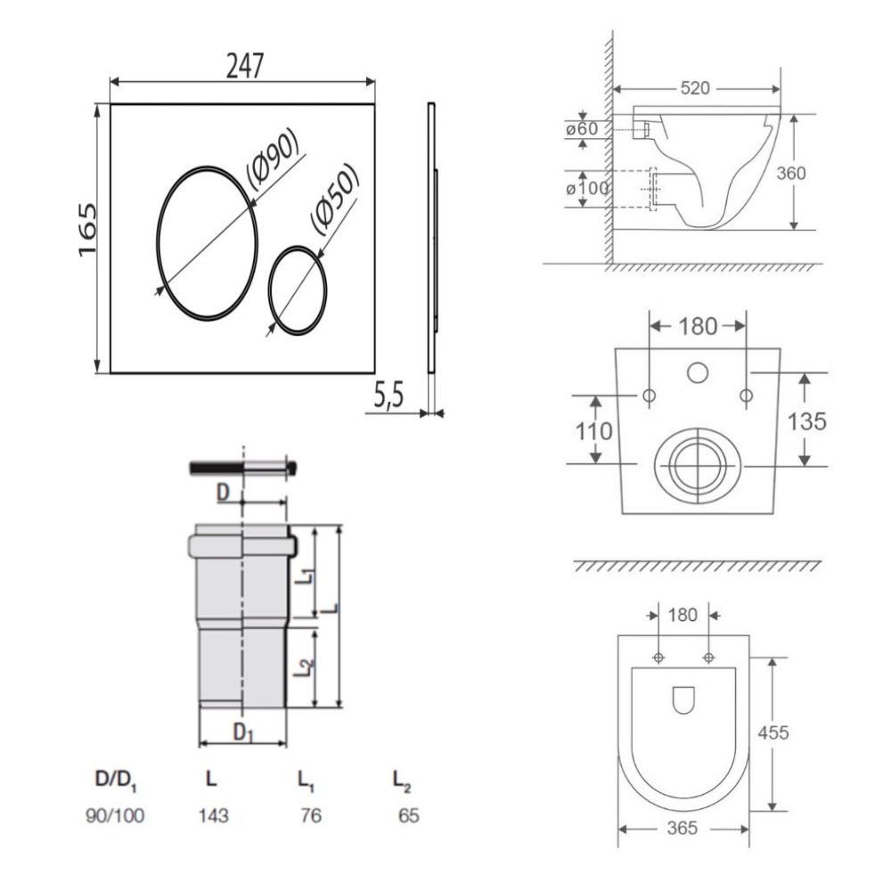 - Pour l’installation d’un WC suspendu avec un pas de raccordement de 180 mm ou 230 mm