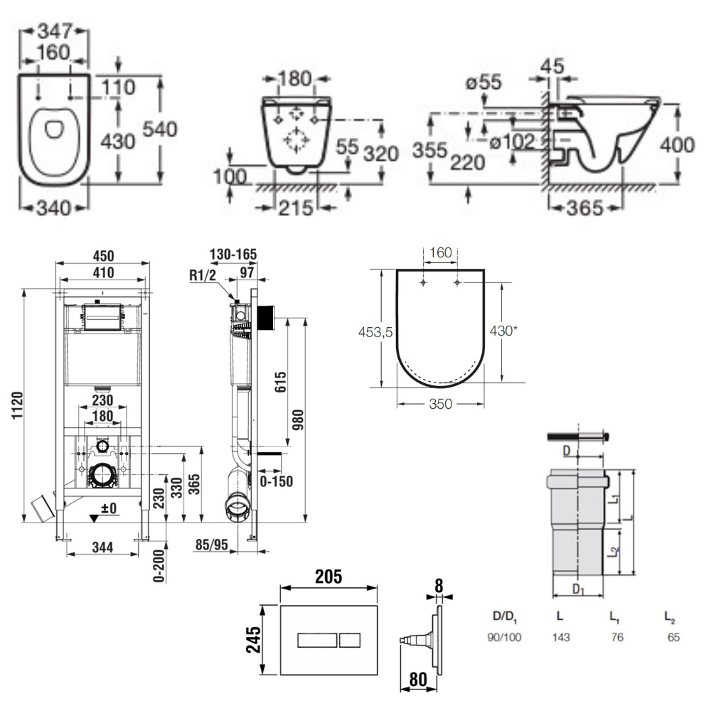 Caractéristiques du pack WC bâti-support ECO 2 L Roca + WC suspendu Roca avec abattant SoftClose + plaque chrome brillant (ROROGAWR05-FR) :