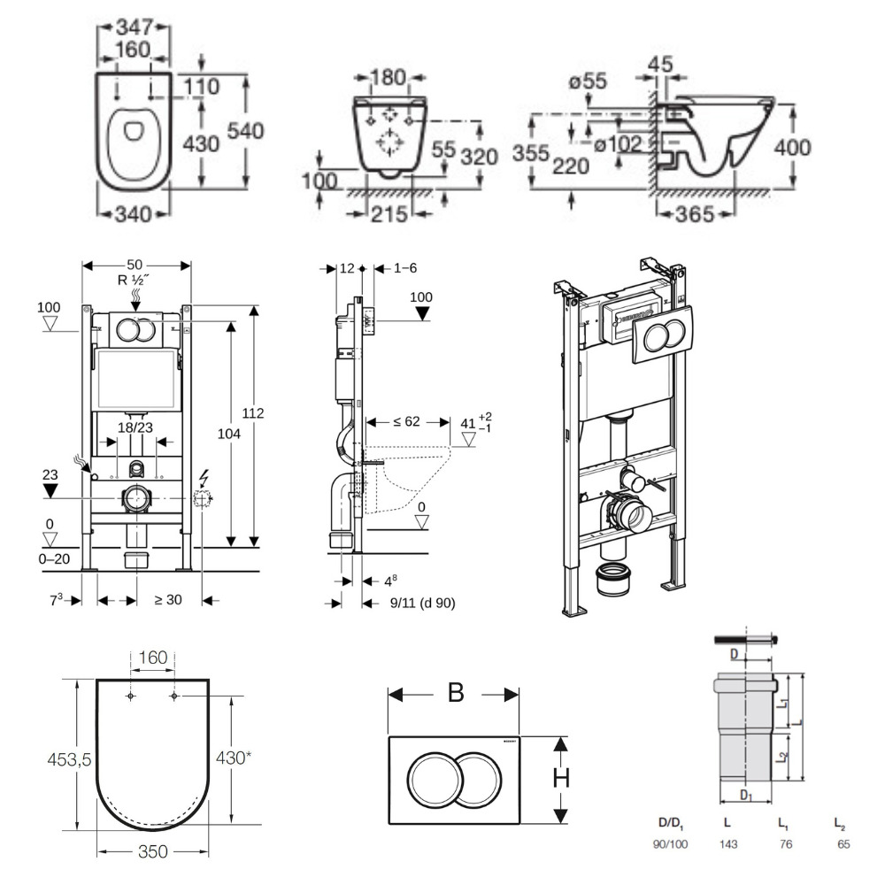 Caractéristiques du pack WC bâti-support Geberit Duofix + WC suspendu sans bride Roca avec abattant SoftClose + plaque blanche (GEBROGAWR01-FR) :