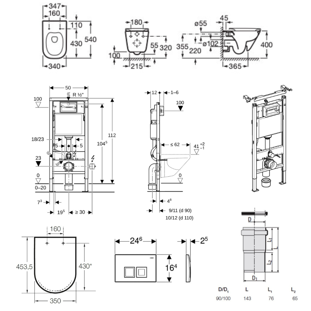 Caractéristiques du pack WC bâti-support UP100 Geberit Duofix + WC suspendu sans bride Roca avec abattant SoftClose + plaque blanche (GEBROGAWR03-FR) :
