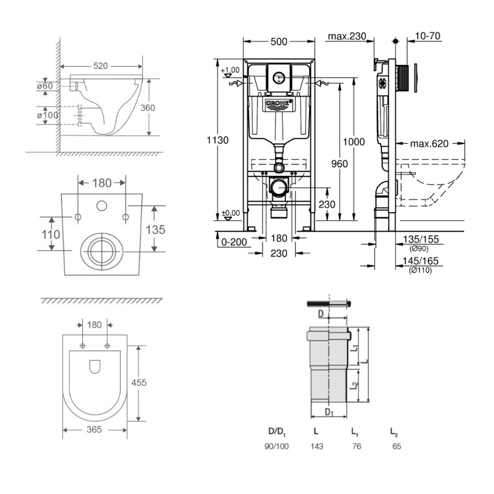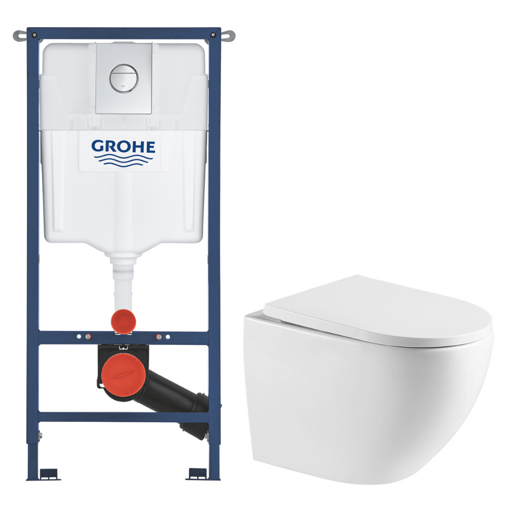 Caractéristiques du pack WC kit bâti-support 4 en 1 Grohe Solido + WC suspendu sans bride Swiss Aqua Technologies avec abattant SoftClose + plaque chrome (GRRST67WR01-FR) :