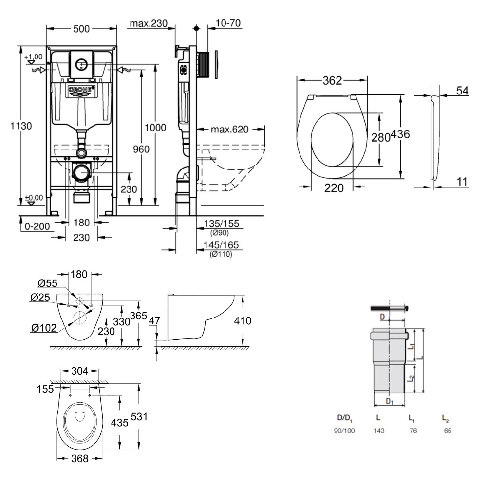 Solido pack WC bâti 4 en 1 + WC suspendu sans bride Grohe avec abattant SoftClose + plaque (GRRSTBAWR01-FR)