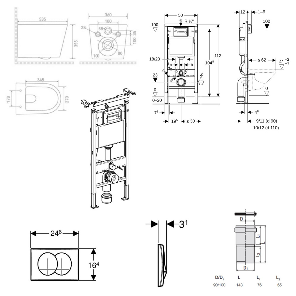 Caractéristiques du pack WC bâti-support Geberit Duofix UP100 112 cm + WC suspendu sans bride avec abattant SoftClose Ceramia + plaque blanche (GEBCE14WT02MAN-FR) :