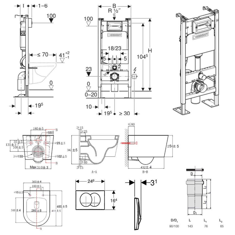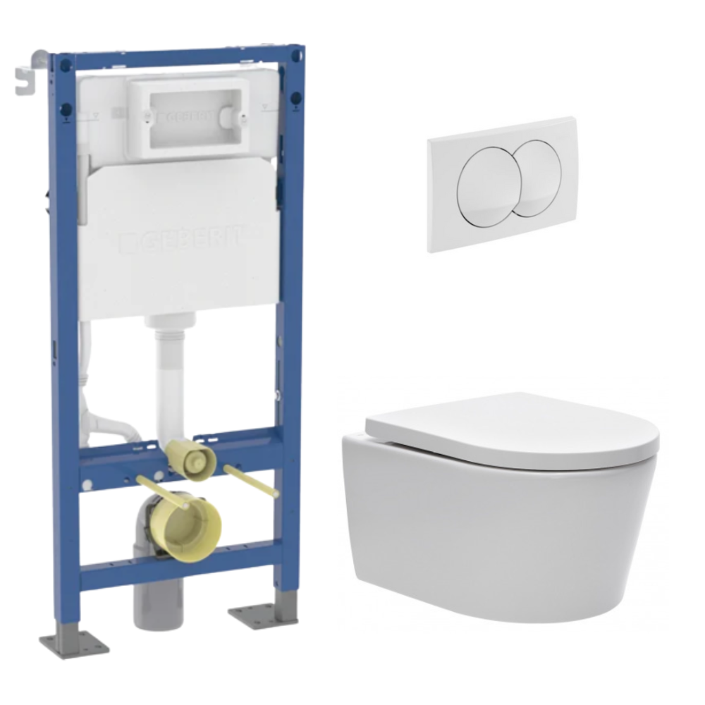 Caractéristiques du pack WC bâti-support autoportant Geberit Duofix 112 cm + WC suspendu sans bride avec abattant SoftClose Swiss Aqua Technologies + plaque blanche (GEBSTBRWR03MAN-FR) :