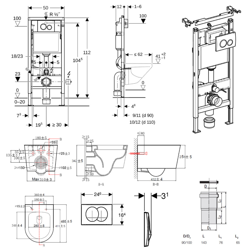 - Geberit Pack Bâti-support Duofix 112cm + Plaque de commande Delta20 blanc alpin + fixations murales (458.134.11.3)