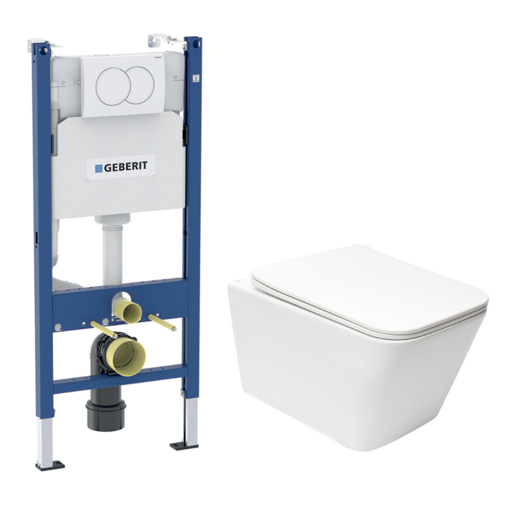 Caractéristiques du pack WC bâti-support Duofix 112cm Geberit Delta + WC suspendu sans bride Swiss Aqua Technologies avec abattant SoftClose + plaque blanche (GEBSTINFWR01MAN-FR) :