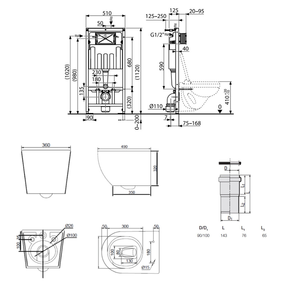 - Pour l'installation d'un WC suspendu avec une distance de raccordement de 180 mm ou 230 mm