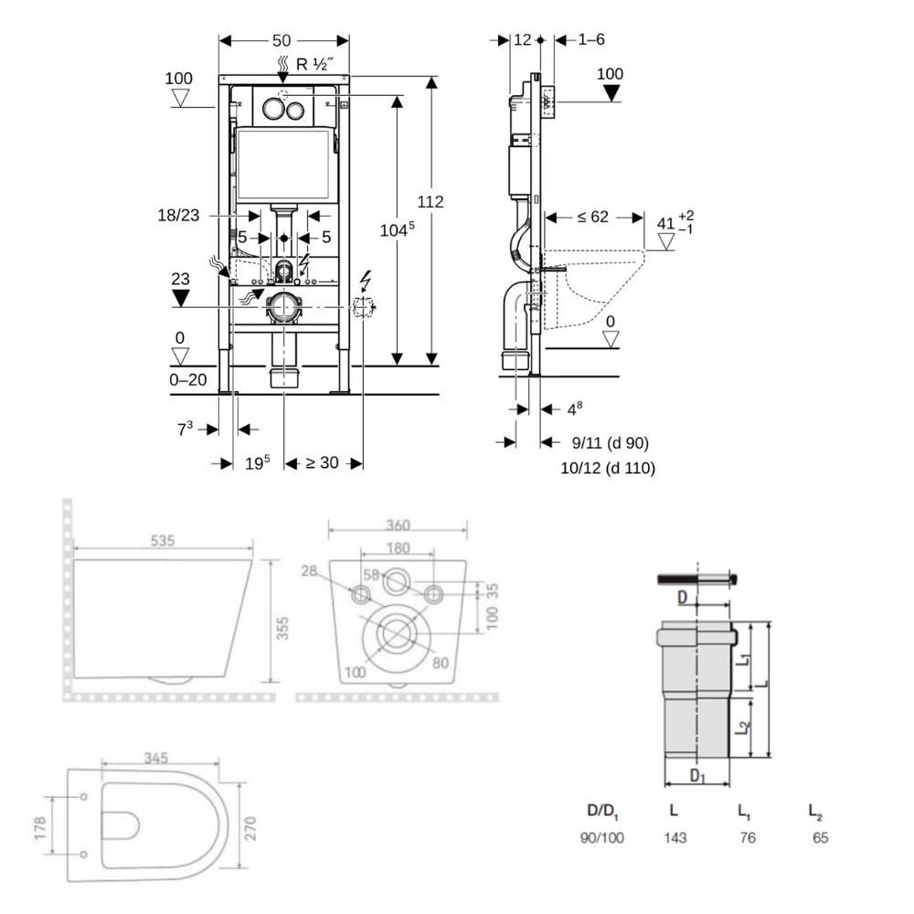 - Geberit Pack Bâti-support Duofix 112cm + Plaque de commande Delta20 blanc alpin + fixations murales (458.134.11.3)