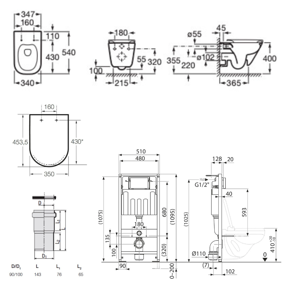 Caractéristiques du pack WC bâti-support sol-mur Villeroy & Boch + WC suspendu sans bride Roca avec abattant SoftClose + plaque (VBROGAWR03-FR):