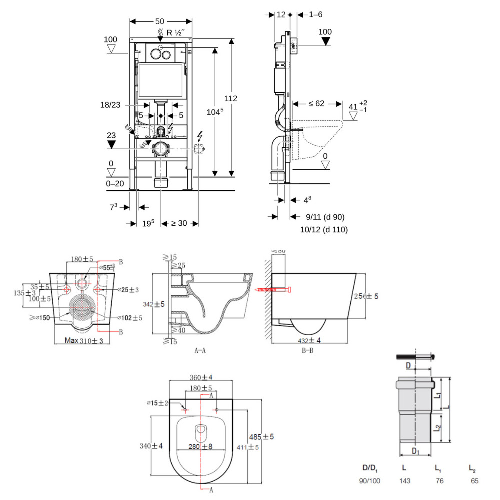 Ces bâti-supports pour WC suspendus ne peuvent être installés contre des cloisons en plaques de plâtre à âme alvéolaire en carton, contre des cloisons en plaques de plâtre sur ossature métallique ou contre des cloisons de séparation double peau en plaques de plâtre sur ossature métallique sans accessoirisation additionnelle (substitution des pieds fournis par des pieds autoportants) ou l'ajout de renforts complémentaires (à intégrer au préalable dans la cloison au niveau des fixations hautes).