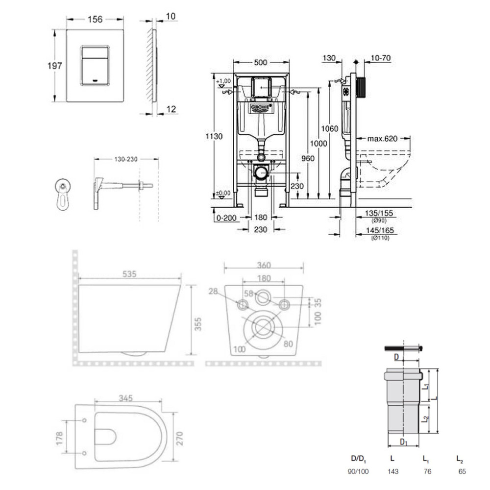 Caractéristiques du pack WC bâti-support Grohe Rapid SL + WC suspendu sans bride avec abattant SoftClose Ceramia + plaque chrome (GRRCE14WT01FR-FS) :