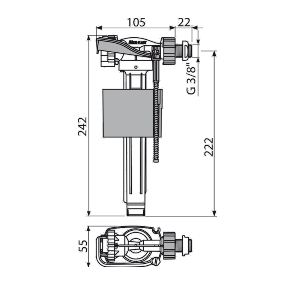 Caractéristiques de la vanne de remplissage à entrée latérale métallique, pour citernes et modules de toilettes pré-muraux, Alca (A160P-38) :