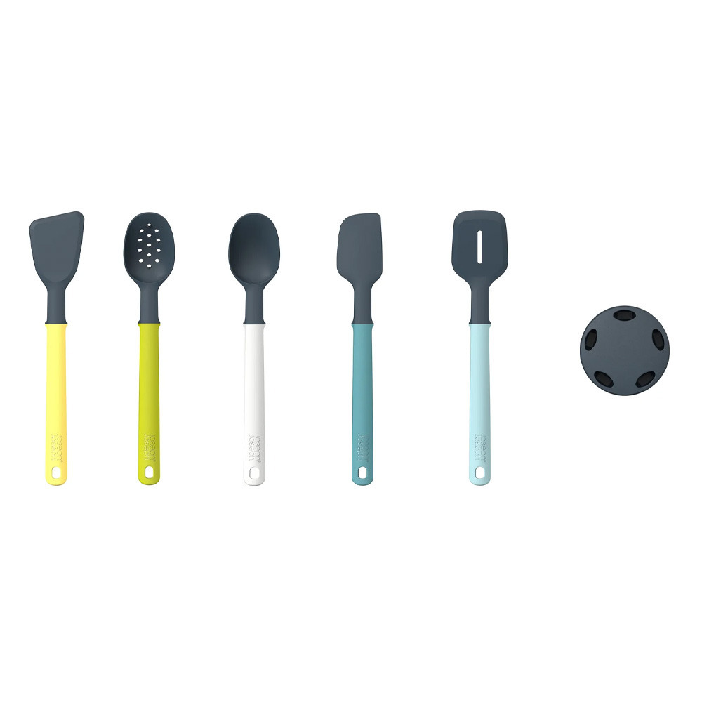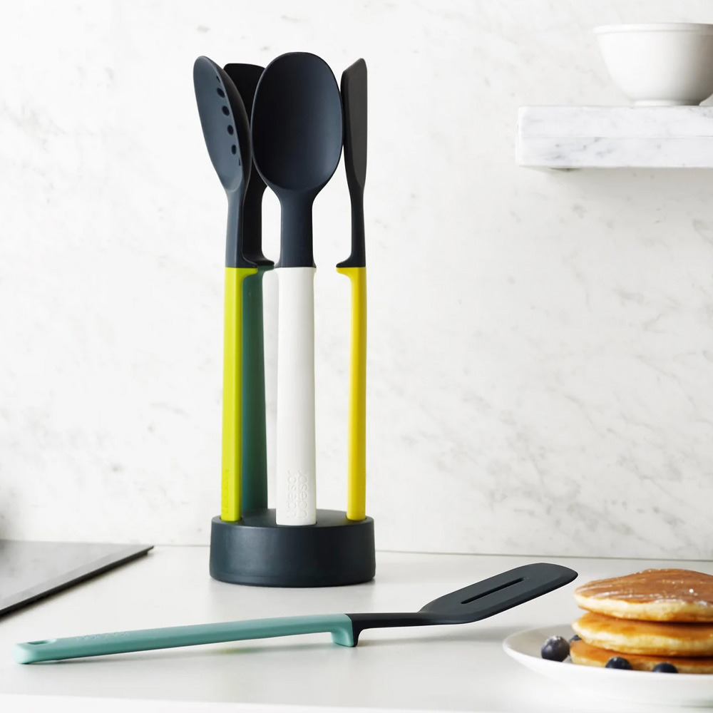 Cet ensemble d'ustensiles de cuisine comprend 5 ustensiles essentiels avec un support de rangement ultra-compact pour les ranger qui permet de gagner de la place sur votre plan de travail.