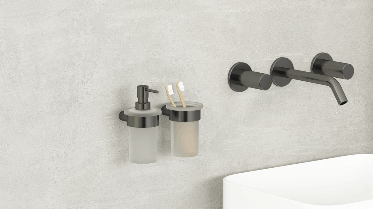 Ayez le souci du détail avec le distributeur de savon mural en verre dépoli Gun métal de Swiss Aqua Technologies (SAT).