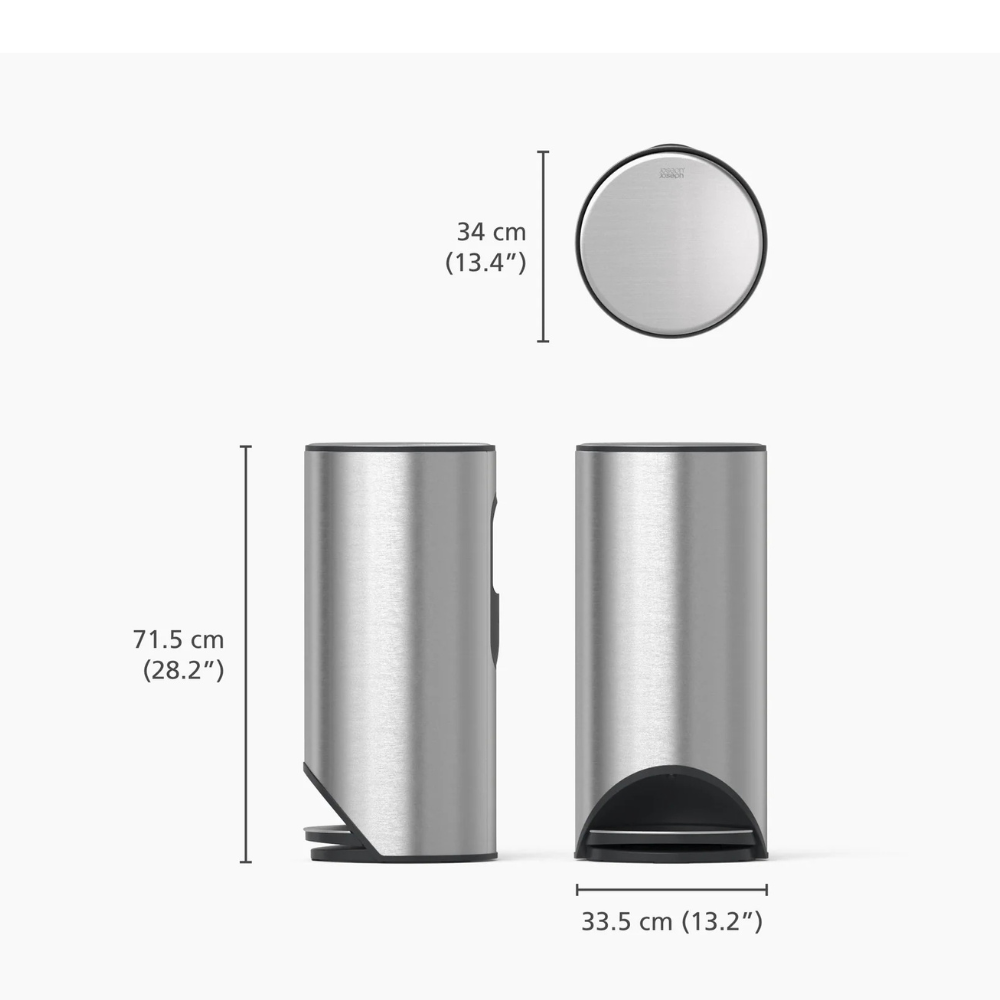 Cette superbe poubelle circulaire de 30 litres allie style et qualité. Sa pédale intégrée permet une ouverture facile sans encombrer l’espace. Le couvercle à fermeture douce est doté d’un revêtement anti-traces de doigts pour un look toujours impeccable.