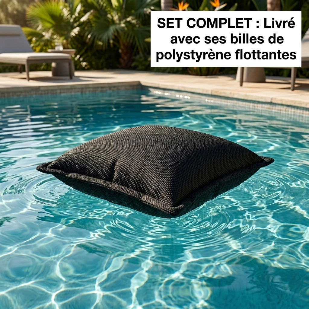 Coussin piscine flottant 65x65 cm noir – billes incluses (à remplir) – intérieur / extérieur (CF6565-7-SET)