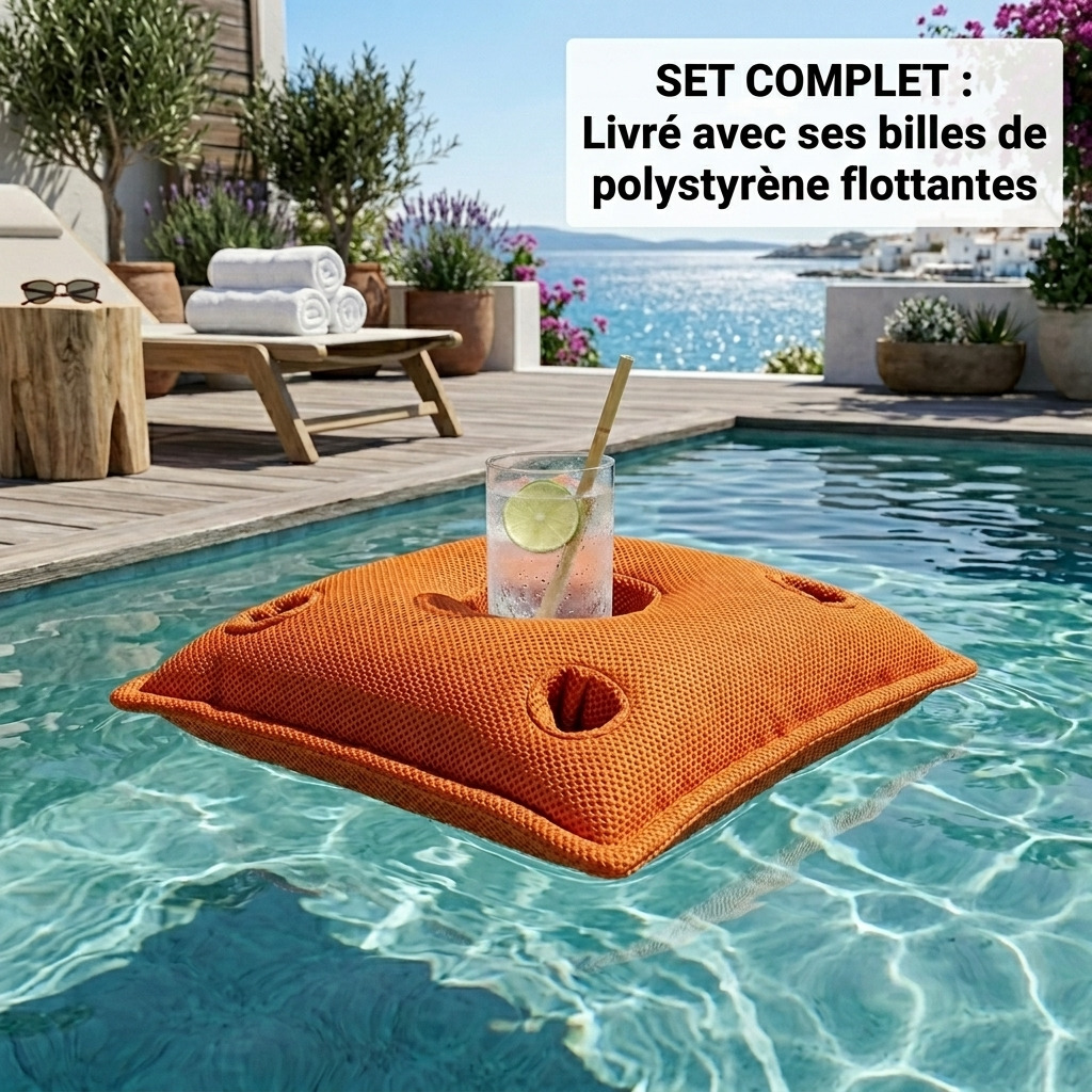 Coussin piscine flottant porte-verres 75x75 cm orange – billes incluses (à remplir) – intérieur / extérieur (PPF7575-6-SET)