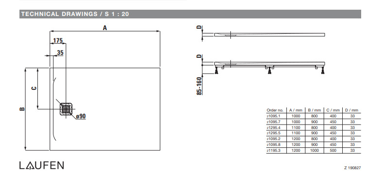 Caractéristiques du receveur de douche en gel coat Marbond, extra-plat, rectangulaire, évacuation sur le côté court du receveur 100x90, Blanc mat, Laufen Pro (H2109570000001) :