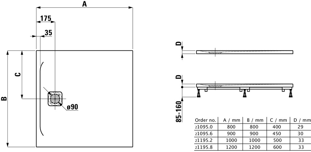 Pro Receveur de douche en gel coat Marbond extra-plat carré, évacuation sur le côté 100x100, Gris mat H2119520780001