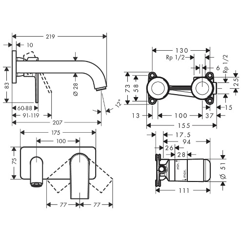 Hansgrohe Vernis Shape Mitigeur de lavabo encastré mural, 2 sorties, bec 207 mm, Noir mat (71578670) :
