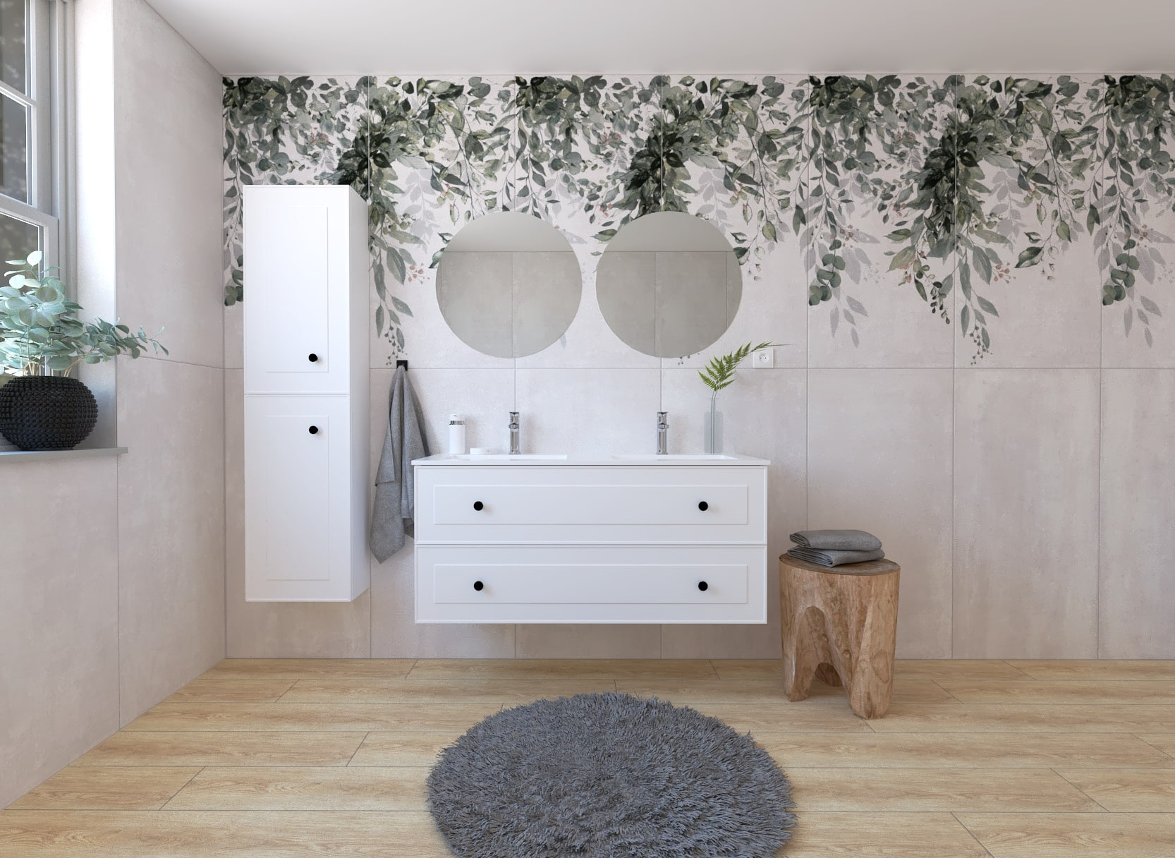 - 2x miroir rond avec éclairage LED sans interrupteur, diamètre 60 cm. La température de couleur de l'éclairage est de 6 000 K (blanc plus froid). Il est protégé contre les projections d'eau avec une protection IP44.