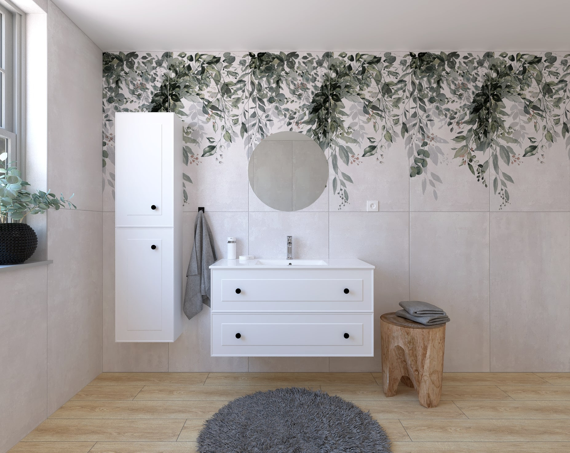 - Miroir rond avec éclairage LED sans interrupteur, diamètre 60 cm. La température de couleur de l'éclairage est de 6 000 K (blanc plus froid). Il est protégé contre les projections d'eau avec une protection IP44.