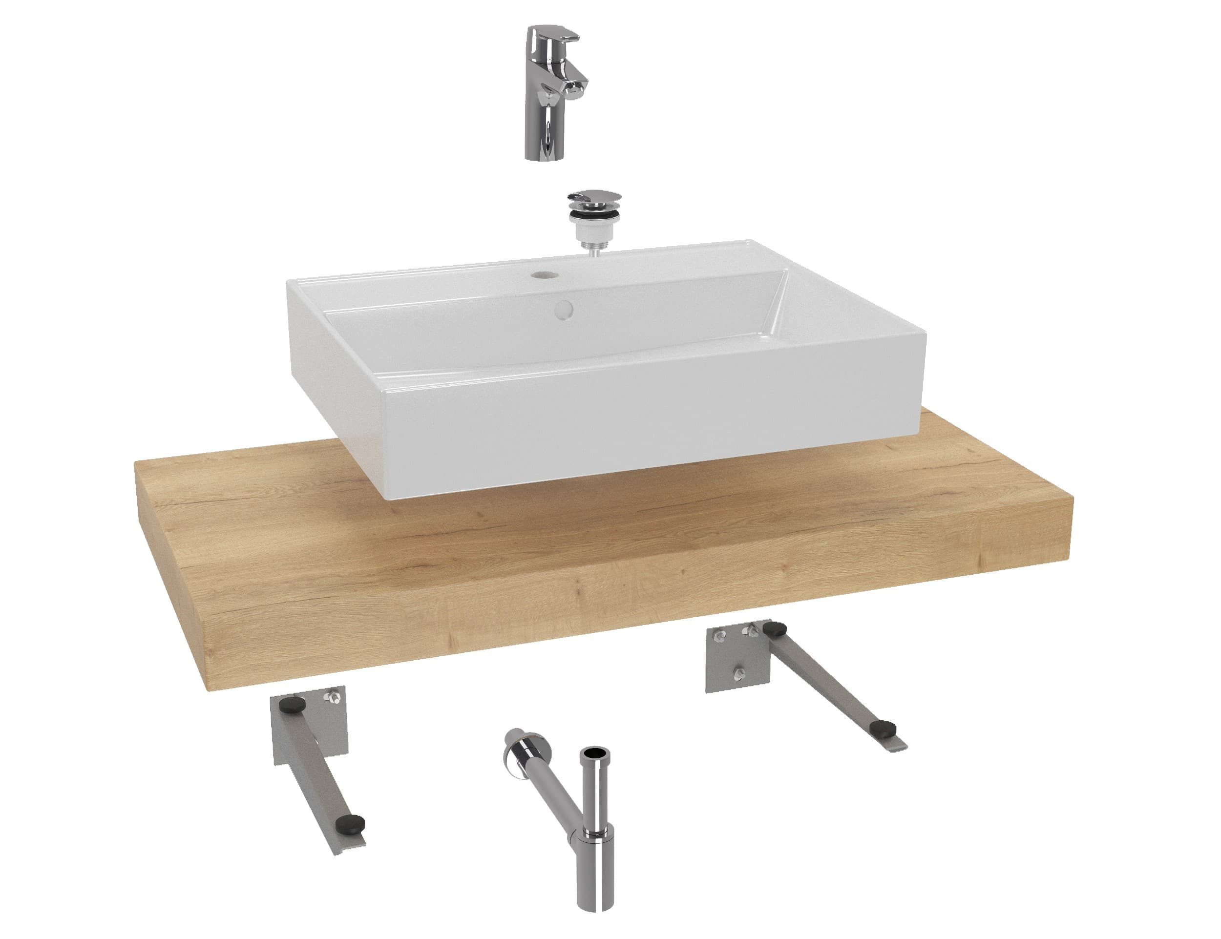 L'ensemble de salle de bain à prix réduit se compose de sept produits : robinet, lavabo, plaque sous le lavabo, bouchon, siphon, console 2x
