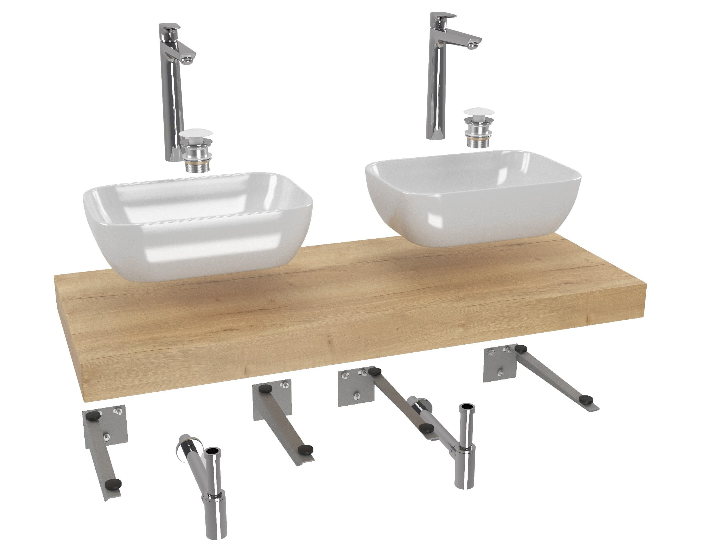 L'ensemble de salle de bain à prix réduit se compose de treize produits - robinet 2x, lavabo 2x, plaque sous le lavabo, bouchon 2x, siphon 2x, support 4x
